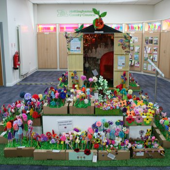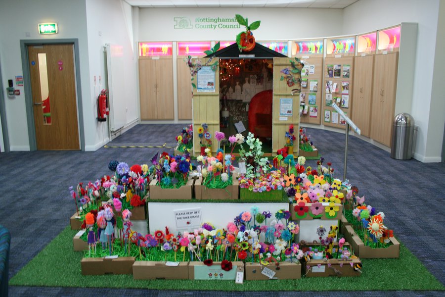 In 2016, Nottinghamshire schools and artists were inspired by the fantastic stories of Roald Dahl. Together they created amazing artworks for Mansfield Central Library gallery and an ‘interactive reading shed’ packed with colourful characters, all set in a garden of wonderful woolly flowers made by our talented library craft groups.