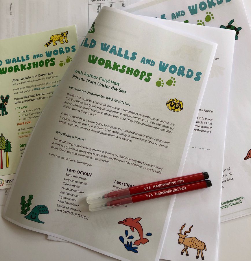 Inspire gave away free arts kits. Participants collected a pack of materials from the library that had everything they needed to join in with the online workshops, including some special pens to create great artwork, cool stuff to write on and lots of ideas for making great poems.