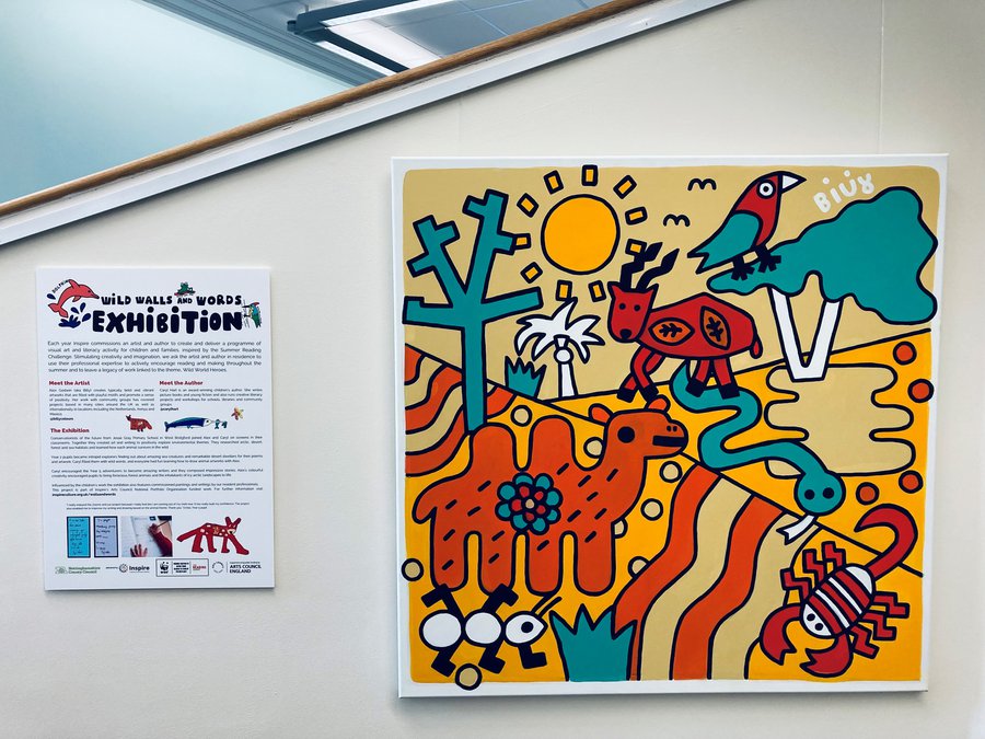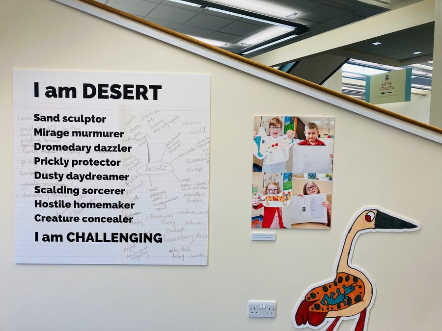 Alex and Caryl worked with pupils from Jesse Gray Primary School to create art and writing to positively explore environmental themes. Influenced by the children’s work the exhibition at West Bridgford Library Gallery featured commissioned paintings and writings by our resident professionals.