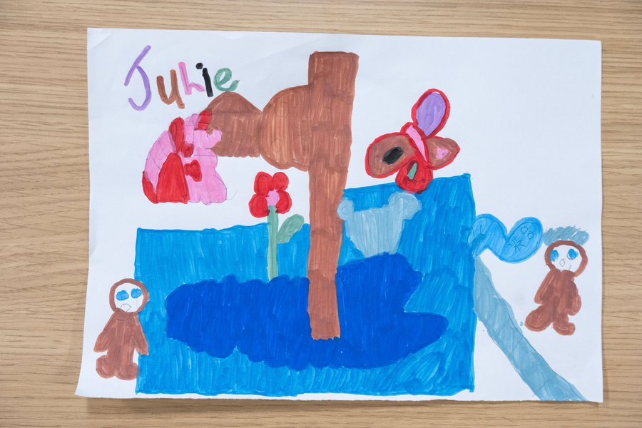 Callum tried to ‘go with the flow’, as they say, and carry on floating. But, as more and more of Julie’s pink thirsty flowers were added to her garden, the water level in the pool slowly began to dwindle until Callum was touching the bottom. He could no longer float or swim in the pool and felt dejected. But then realised that the flowers would need that water to survive, whilst he could easily find somewhere else to swim, and besides, this was a good excuse for a mini adventure!