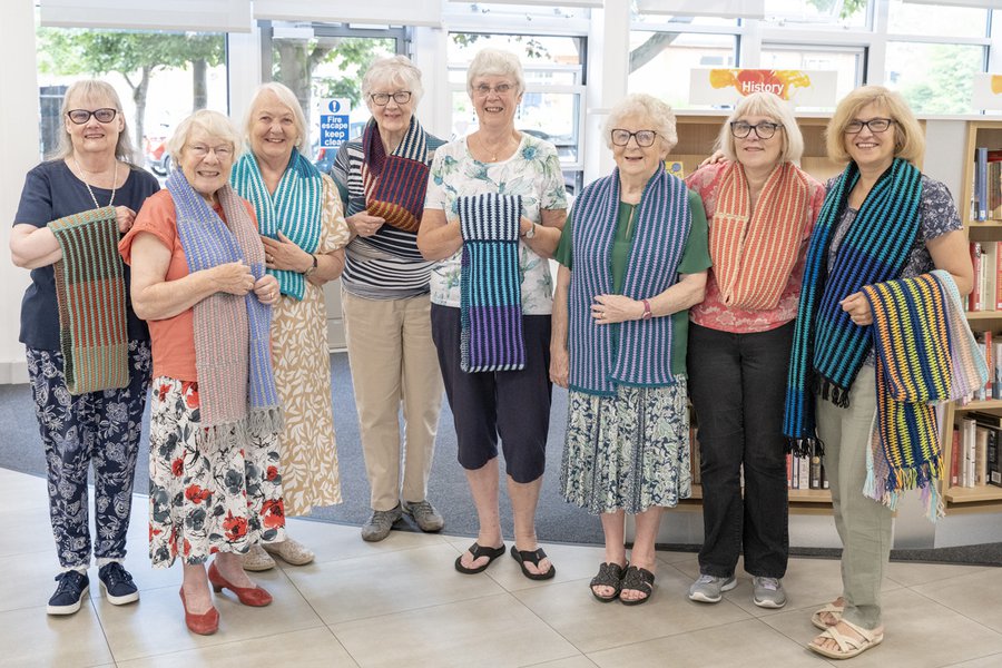 More than 500 beautiful handmade Wrapped scarves have been made for this exhibition at West Bridgford Library.